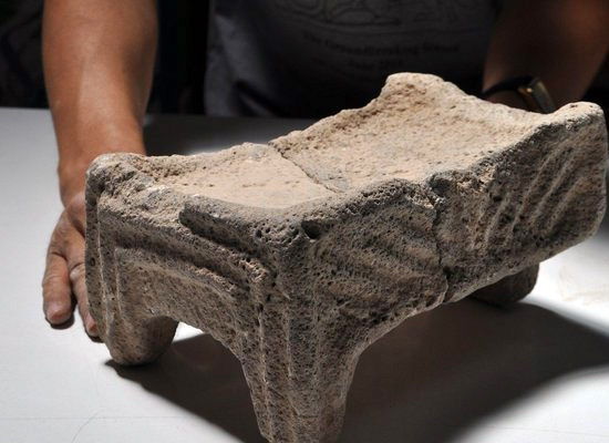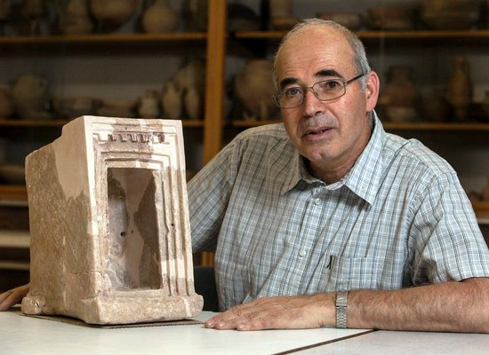 Yosef Garfinkel, an archaeologist at the Hebrew University of Jerusalem, shows off an ark, or stone shrine model, that was found during excavations at Khirbet Qeiyafa, an ancient settlement southwest of Jerusalem.