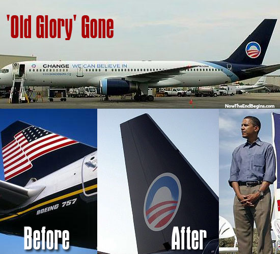 As part of a month-long aircraft makeover, a painted American flag was removed from the tail of Sen. Barack Obama’s official campaign airplane and was replaced with the presidential candidate’s trademark “O” symbol.
