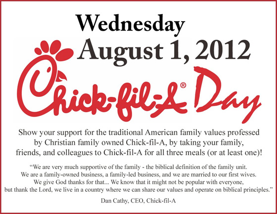 “No one is being asked to make signs, speeches, or openly demonstrate,” Huckabee wrote on his Facebook page. “The goal is simple: Let’s affirm a business that operates on Christian principles and whose executives are willing to take a stand for the Godly values we espouse by simply showing up and eating at Chick-Fil-A on Wednesday, August 1.