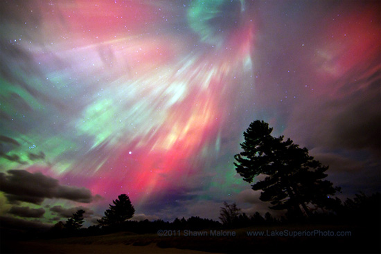 This spectacular photo of red, pink and green auroras on Oct. 24, 2011 was taken by photographer Shawn Malone of Marquette, Michigan, from the shore of Lake Superior CREDIT: Shawn Malone