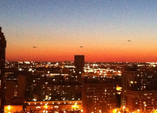 At least three Blackhawk helicopters flying at time in close order formation – at other times separating fairly widely – zoomed around office and residential towers for several hours.