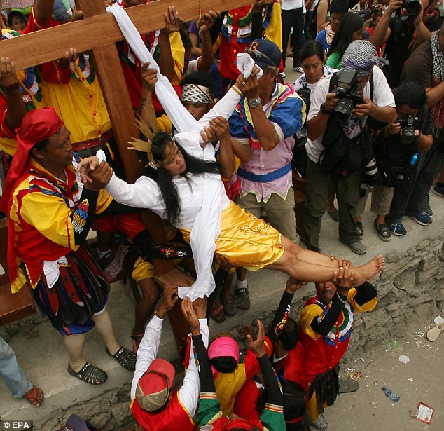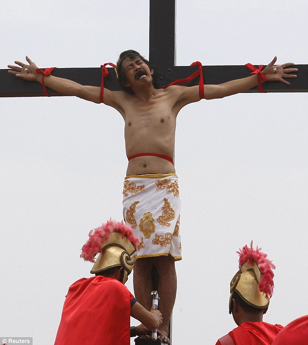 Horror: Percy Valencia, 41, is hoisted up onto a cross before being 'crucified' for a few minutes today .