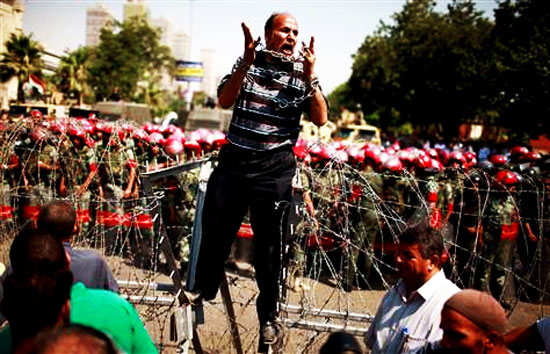 A protester shouts as he stands on top of a barricade in front of soldiers outside the Supreme Constitutional Court in Cairo