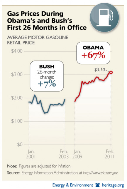 “Ah, January of 2009. Hope was in the air, but more importantly, gas was under two dollars a gallon. Since then gas prices, have gone up 67 percent and it’s an ominously upward trend. Interestingly enough, the Heritage Foundation also took a look at the first 26 months of Bush’s presidency — gas only rose 7 percent during that time frame. Now obviously turmoil in the Middle East has something to do with our current astronomical gas prices, but keep in mind that by this point in the Bush presidency 9/11 had happened and we were on the verge of invading Iraq. So while the president can’t be entirely responsible for global commodity prices, it’s still worth asking what Obama’s doing to make things worse.