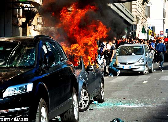 Italy: Protesters look at a parked car on fire during a demonstration, in downtown Rome after tens of thousands marched today as part of a global day of protests
