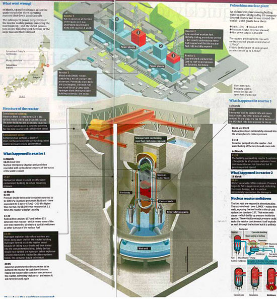 The nuclear power plant in northeastern Japan has been leaking radiation making its way into food and water. The discovery of puddles with radiation levels 10,000 times the norm sparked a temporary evacuation of the plant on Thursday. Two workers who stepped into the water were hospitalized with possible burns. The development set back feverish efforts to start up a crucial cooling system knocked out in a massive March 11 earthquake and tsunami, but has helped experts get closer to determining the source of the dangerous leak.” source – MSNBC