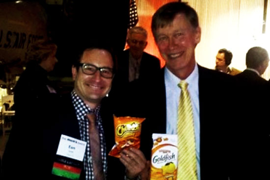 Gov. John Hickenlooper, right, poses with Ean Seeb, co-owner of Denver Relief, one of the state’s largest dispensaries, holding Cheetos and Goldfish, the two things Hickenlooper told marijuana users not to “bust out” too quickly in the wake of Amendment 64′s passage. (Photo: Denver Relief Consulting)