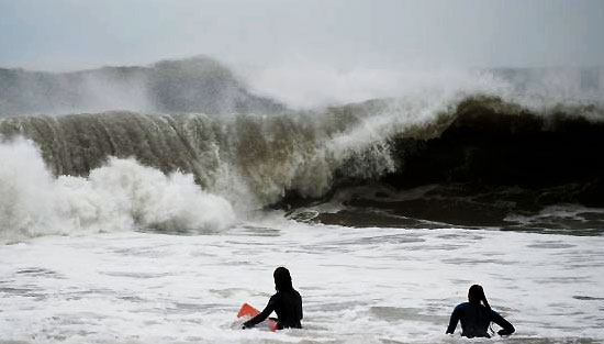 Surfers make their way to large waves generated by Hurricane Sandy on Beach 90th Street in the Rockaway section of Queens, Sunday, October 28, 2012. (Charles Eckert/Weather.com