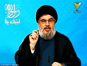 Arguing for action: Hezbollah leader Sheik Hassan Nasrallah pushed for the creation of an international law that would ban insults of Islam in wake of the offensive film that prompted global protests