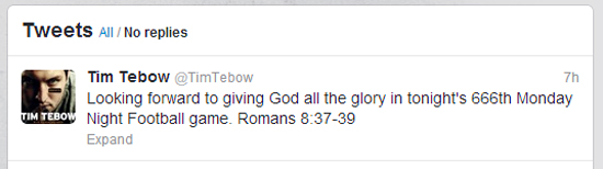 On the second Monday of October, Tebow took a respite from reading his papyrus playbook to declare his intentions for the eve: “Looking forward to giving God all the glory in tonight’s 666th Monday Night Football game. Romans 8:37-39.”