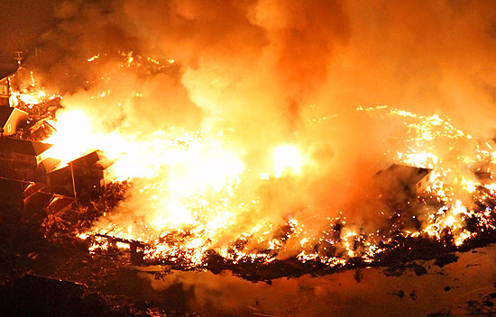 Houses are shown in flame while the Natori river floods over the surrounding area by tsunami tidal waves in Natori city, Miyagi Prefecture, northern Japan