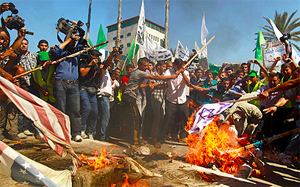 Protesters waved the flags of the Hamas and Islamic Jihad movements, and set fire to American flags, chanting “Death, death to America, death, death to Israel.”