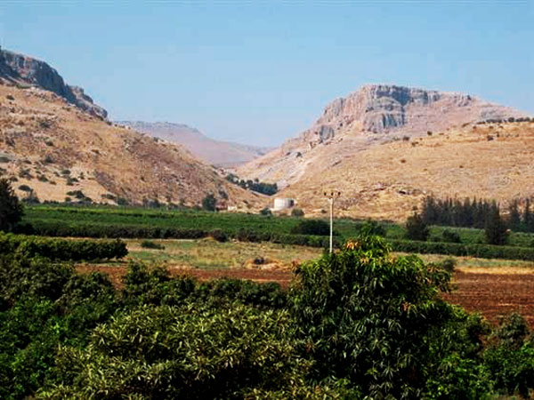 View looking southwest showing the mountains bounding the Ginosar Valley in Israel. Archaeologists found pottery remains, cubes known as tesserae and, in the modern town, architectural fragments indicating a town flourished in the area from the second or first century B.C. until after the fifth century A.D.