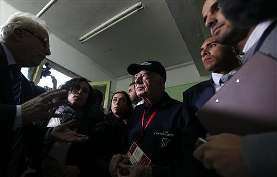 Former US President Jimmy Carter, center, visits a polling site during run-off voting in the parliamentary election in Cairo, Egypt, Tuesday, Jan. 10, 2012. Former President Jimmy Carter on Tuesday dismissed concerns about the success of Islamist parties in Egypt's first elections since the fall of President Hosni Mubarak, because it represents the will of the Egyptian people. (AP Photo/Khalil Hamra)