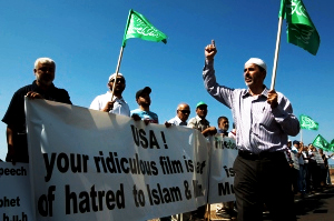 Arab-Israeli Muslim men protest in front of the U.S. embassy in the Mediterranean coastal city of Tel Aviv on Sept. 13, 2012 against a film mocking Islam. (credit: JACK GUEZ/AFP/Getty Images)