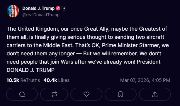 As the war enters its second week, Trump continues to demand Iran’s “UNCONDITIONAL SURRENDER,” as he put it in a Truth Social post, and has suggested he should have a role in picking the country’s next leader.