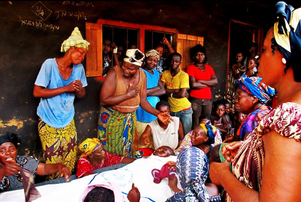 The relatives of Polin Pumandele mourn him during his funeral ceremony.