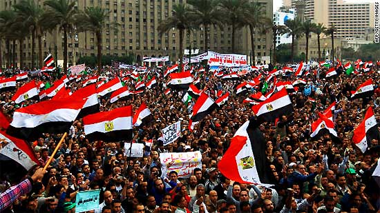 Thousands of Salafi protesters arrived in Cairo from different parts of the country, many waving flags and singing the national anthem while youth groups guarded entrances to the square to prevent thugs from slipping through.
