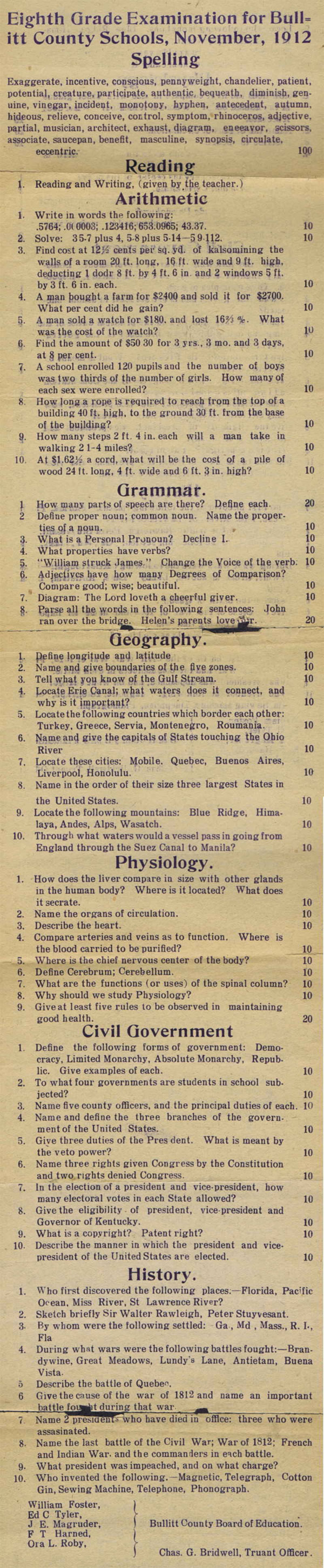 Yet, this was just a standard, average test in 1912 of an eighth-grader’s knowledge. Go ask your eighth grader to take this test with you. And just for fun, look close at question #7 in the Grammar section. This was a public school test.