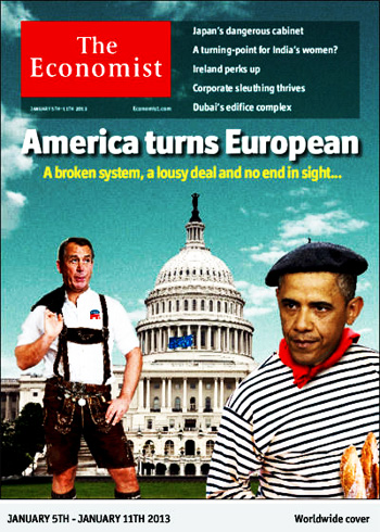 Just Friday, the cover of financial news magazine The Economist depicted Obama wearing a beret, red neckerchief and a striped mariner shirt, under a headline that read “America turns European”. The article criticised the country’s recent fiscal-cliff deal as “lousy”, saying its mismanagement bore striking similarities to the “mess in the euro zone”.