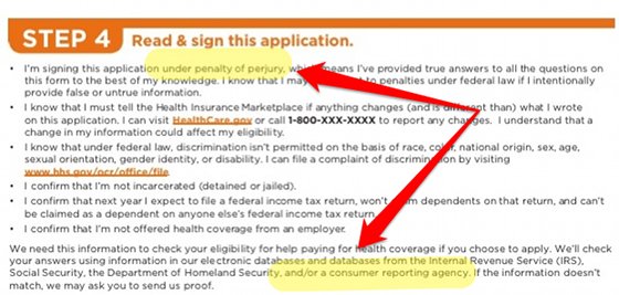 Please note the “fine print” at the bottom where it lists all the government databases it will check your answers against. Looks like the National Citizen Database is another by-product of Obamacare. Heil!