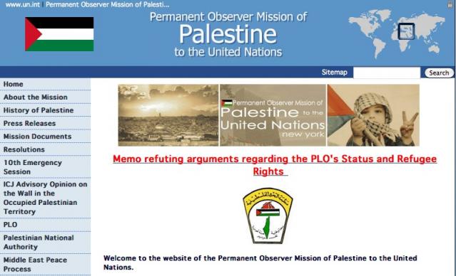 The logo of “the Permanent Observer Mission of Palestine to the United Nations” – on their website and on top of their official statements at the U.N. – shows the Palestinian Authority’s claim to a Palestine that stretches throughout the entire historical entity of the former Palestine mandate.
