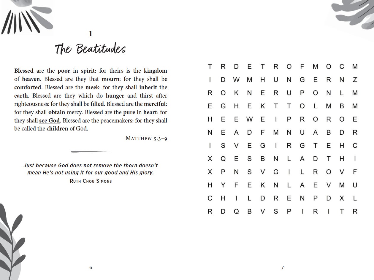 This collection of Bible word search puzzles is focused on the blessings of scripture. Inside, you’ll find 99 inspiring King James Bible passages reproduced in whole, each containing 13–18 bold-faced words to seek in the 12 x 12 puzzle grids.