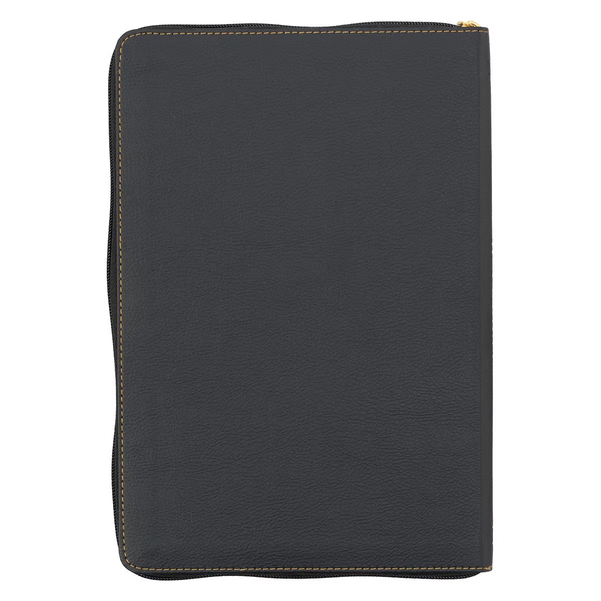 The magnified text and the plain yet sophisticated design of the Black Faux Leather Large Print Thinline King James Version Bible with Zippered Closure and Thumb Index make it the perfect Bible for a father or son with exceptional taste. The black faux leather cover of the Bible is lightly texturized to mimic the look of genuine leather. Gold-toned topstitching along the edges adds strength to the construction and rounds off the design. The title is presented on the front cover and the spine in an elegant gold-foiled script.