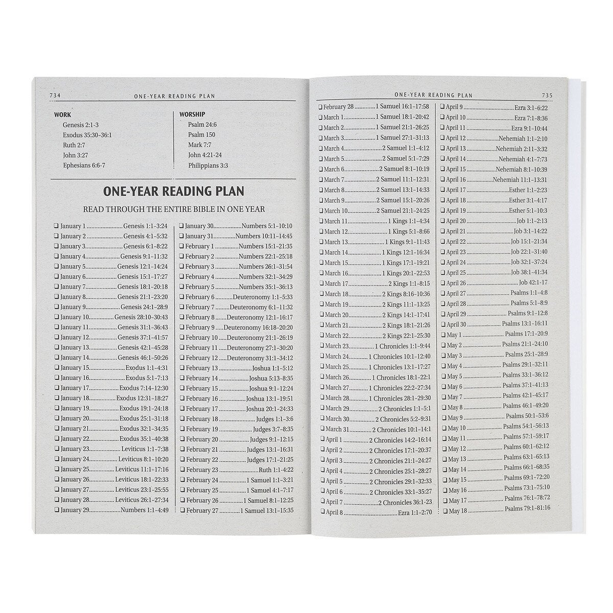 Inside, you’ll find the beloved 1769 KJV text in a standard-size 8-point font. The Bible’s text is laid out in a double column. It has a lay-flat spine that makes reading from edge to edge easy. Helpful extras include a topical verse guide and a one-year reading plan to support daily study.