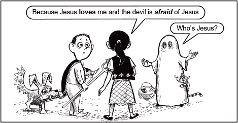 Description: “I’m not afraid of you because Jesus loves me!” The simple Gospel to give young children on Halloween.