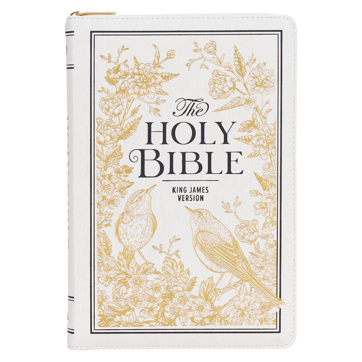 The birds and botany design of the White and Gold Faux Leather Large Print Thinline King James Version Bible with Zippered Closure and Thumb Index paired with its luxury zipper closure and thumb index makes this the perfect gift for an elegant mother or aunt. An exquisite gold-foiled floral design with two perched gold-foiled birds adorns the thinline Bible’s white faux leather front cover. A black double frame surrounds the scene and coordinates with the black-lettered title in the middle of the design, creating a striking yet beautifully synthesized layout.