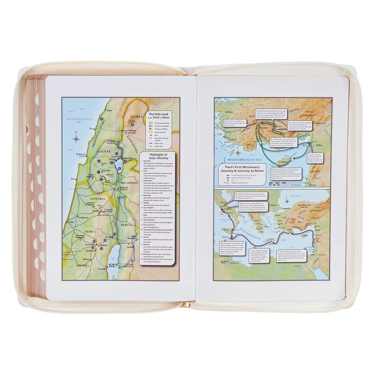 This Bible’s design features include a white zipper with a gold metal zipper pull, ensuring the security of loose notes. The zipper pull is engraved with a cross design. Thumb indexing tabs make navigating the Bible effortless, while gilt-edged pages add an extra touch of shimmer to the overall design. Completing the ensemble is a matching white satin ribbon page marker that provides a convenient way to keep your place. A presentation page in the front of the Bible lets you add a meaningful message to mark a special occasion. This Bible’s comfortable weight and large size make it perfect for holding in church.