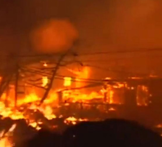 A huge fire destroyed 80 to 100 houses in a flooded beachfront neighborhood Tuesday, forcing firefighters to undertake daring rescues and injuring three people.