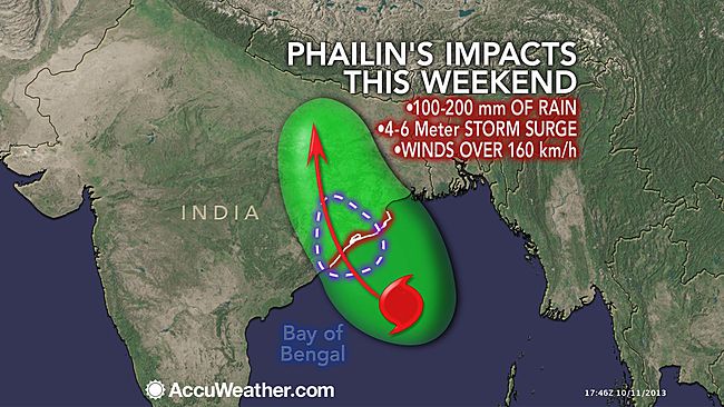 Destructive winds well over 160 kph (100 mph) and flooding rain of at least 100-200 mm (4-8 inches) is expected across a wide area. There will be a crippling storm surge of 4-6 meters (14-20 feet), as well as wind gusts to 250 kph, near the landfall point of Phailin which is expected across northeastern India Saturday morning EDT.