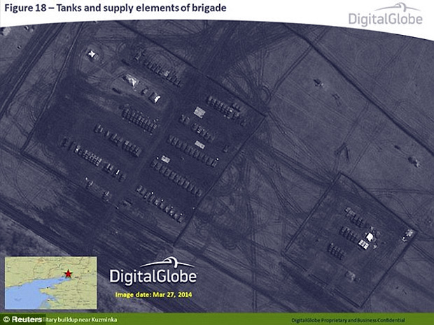 They were taken by a commercial satellite firm called Digital Globe and also showed units of a motorised rifle regiment, a ‘probable’ anti-tank battalion and artillery on March 27. There are even field hospitals, it was claimed.