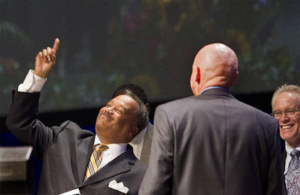 Associated Press/Houston Chronicle, Johnny Hanson – Rev. Fred Luter Jr. points upward after being re-elected as the Southern Baptist Convention’s president during the 2013 Southern Baptist Convention Annual Meeting at the George R. Brown Convention Center Tuesday, June 11, 2013, in Houston. Luter was the SBC’s first black president. (AP Photo/Houston Chronicle, Johnny Hanson)