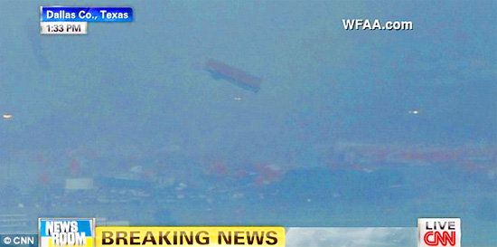 Weather service advisories issued today said storm spotters and radar revealed separate tornadoes south of Dallas and Fort Worth, as well as Arlington and Lancaster. Incredible news footage of the twister shows a massive funnel cloud and tractor trailers being launched above the area.