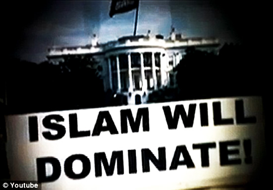 Image: In the video, the White House is shown with a black flag flying overhead and the words Islam Will Dominate