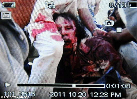 Mobile phone footage, released shortly after the news of his capture broke, appears to show a bloodied Gaddafi being manhandled. Al Jazeera was also repeatedly showing footage of what appeared to be Gaddafi’s shirtless and lifeless body being dragged along the ground. source – Daily Mail UK