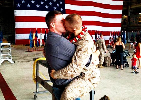 An openly gay marine has caused a stir online after sharing the traditional home-coming first kiss with his boyfriend in Hawaii. Sgt Brandon Morgan of Oakdale, California, was captured as he jumped into the arms of boyfriend, reported by International Business Times to be called Dalan Wells.