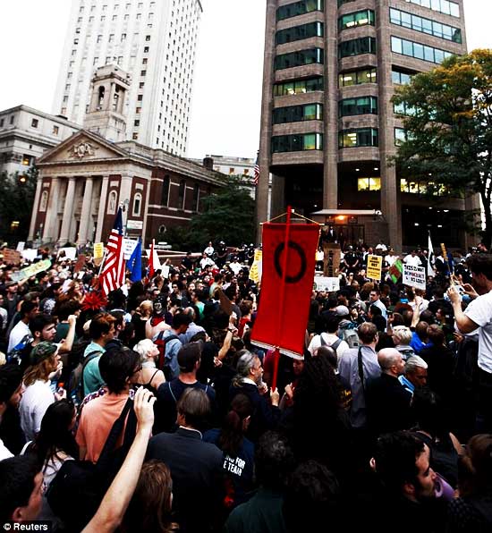 United: Demonstrators from the Occupy Wall Street campaign sit in the plaza in front of the New York Police Department headquarters on Friday